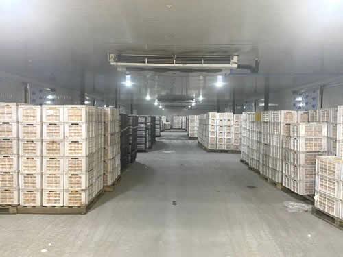 3、在冷庫中,應(yīng)強制通風(fēng),使循環(huán)中的空氣帶走果蔬的呼吸熱。空氣流速過低達不到上述目的,過高又加快食品的水分蒸發(fā),尤其是相對濕度較低時影響更大。如將食品用透汽率低的材料包裝,則空氣的流速和相對濕度對果蔬的水分蒸發(fā)都無影響。冷庫內(nèi)果蔬包裝箱堆放時,相互之間必須留有一定的空間,以利于庫內(nèi)空氣流通,并保持冷庫各部的溫度均勻一致。貯藏物堆放不能太高,與冷庫頂面有60厘米到120厘米的空間、與周邊墻面有50厘米到80厘米距離。
