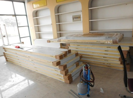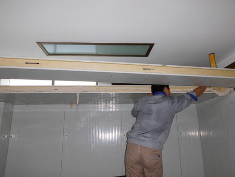 冷庫墻板拼裝完成,準備裝頂板,在裝頂板的同時也是需要先打上發泡劑,以庫華冷庫的密封性,制冷效果好。